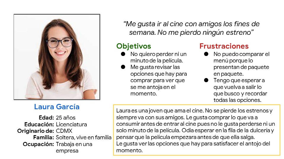 Por otro lado se encuentra el usuario “amigos o parejas”, identificado como Laura, que son personas que acuden en grupo o acompañados y que suelen elegir de forma individual lo que desean consumir.