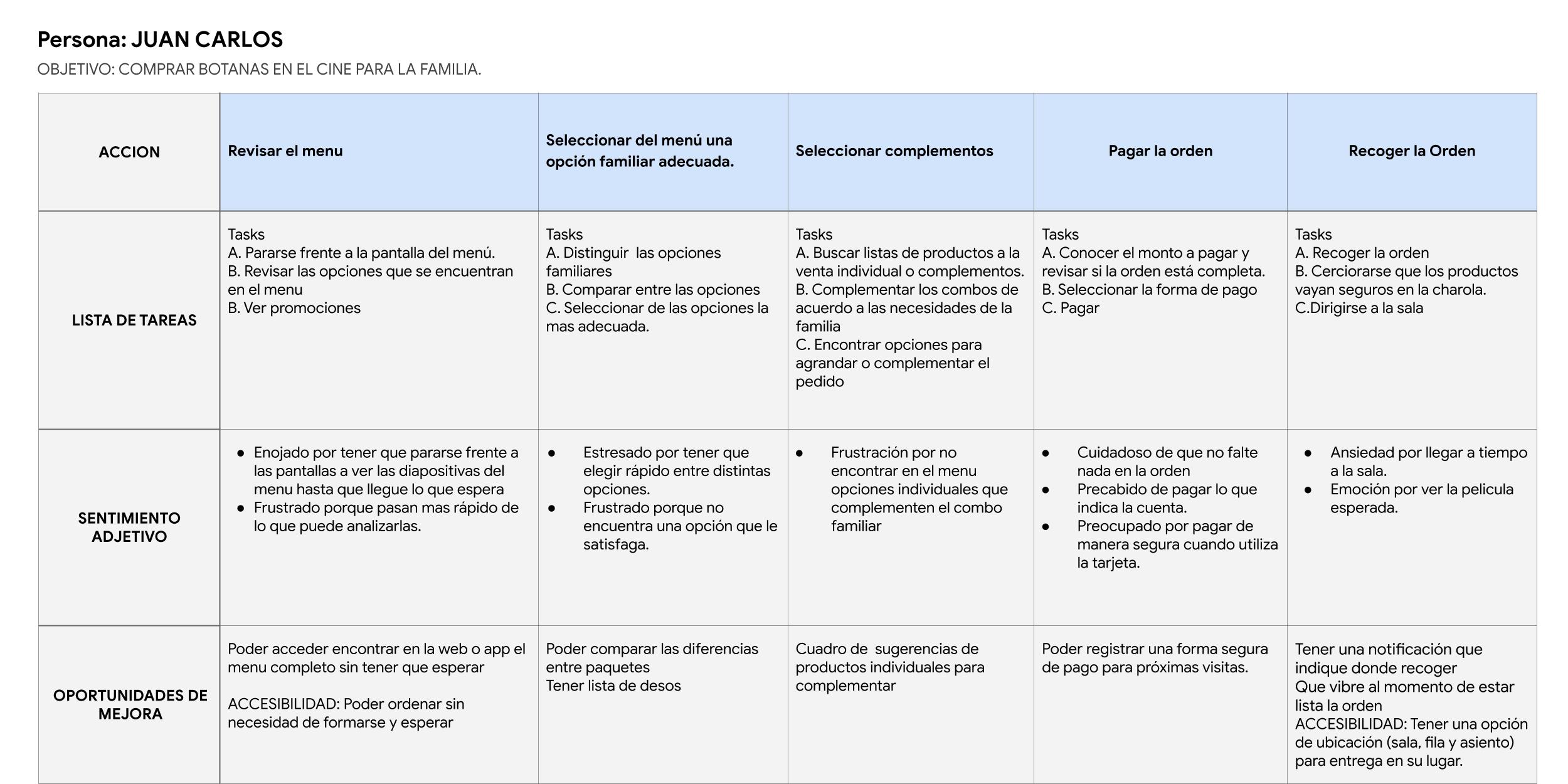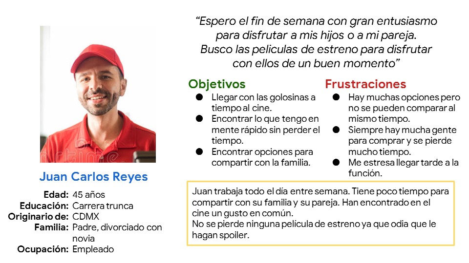 El usuario “Padre de Familia”, representado por Juan Carlos, que acude con distintos miembros de su familia al cine y que tiene la necesidad de encontrar y comparar distintos paquetes para cubrir las necesidades de cada uno de sus miembros al mejor precio posible.