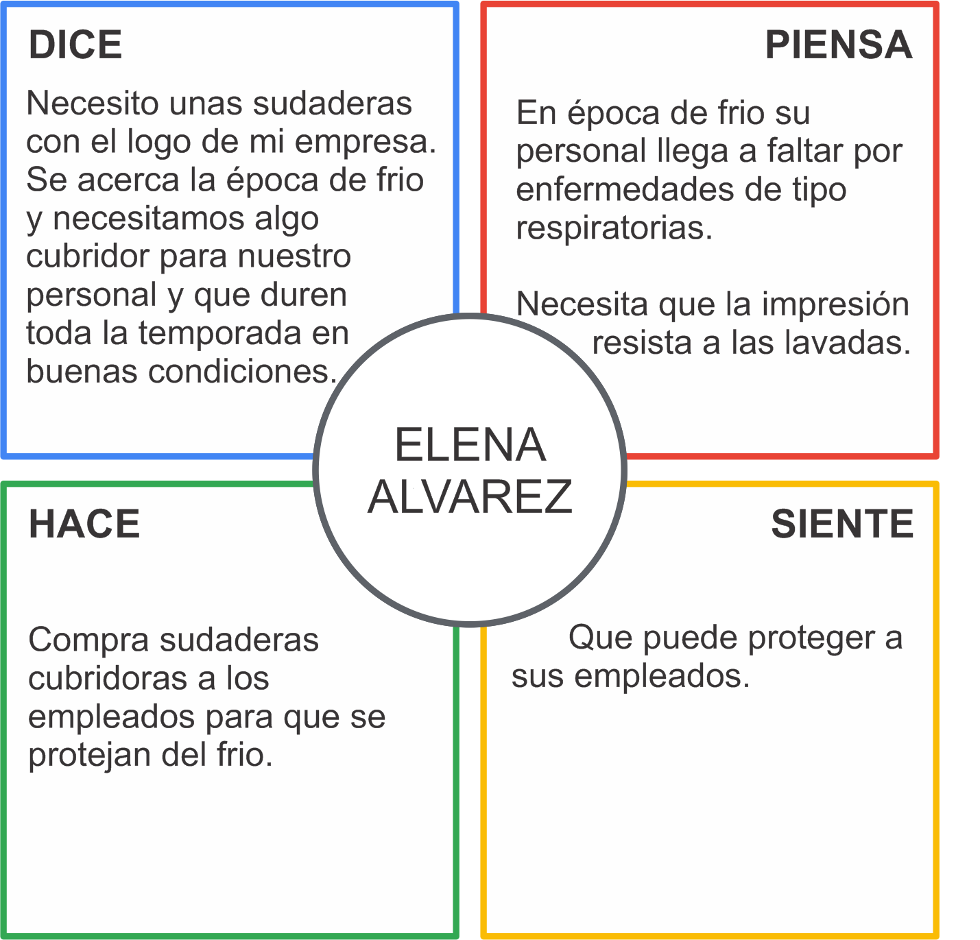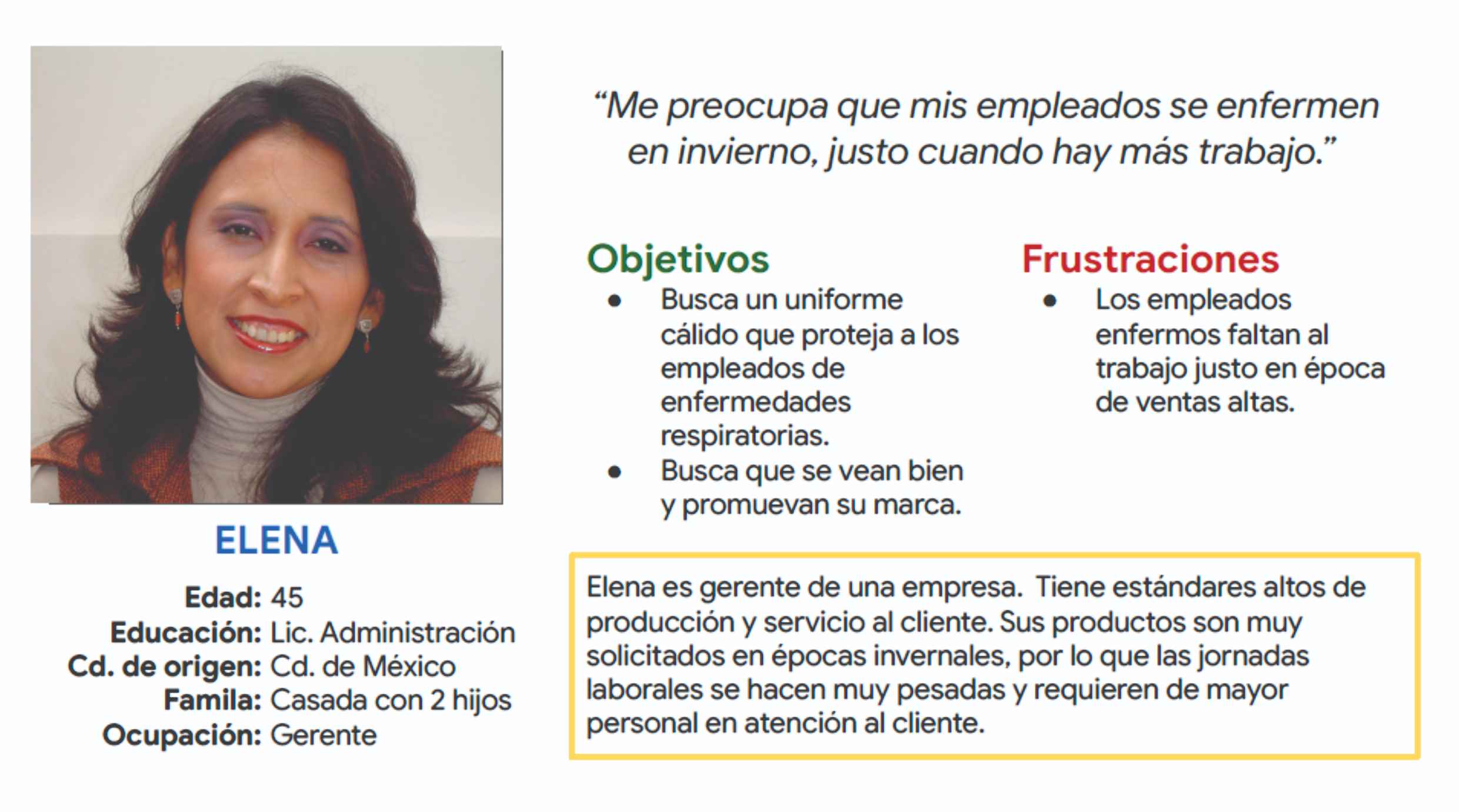 El usuario “Empresario», representado por Elena, quien se muestra ocupada y con muchas responsabilidades dentro de la empresa y que le cuesta trabajo desplazarse al centro de impresión para poder realizar el pedido de los uniformes para sus empleados.