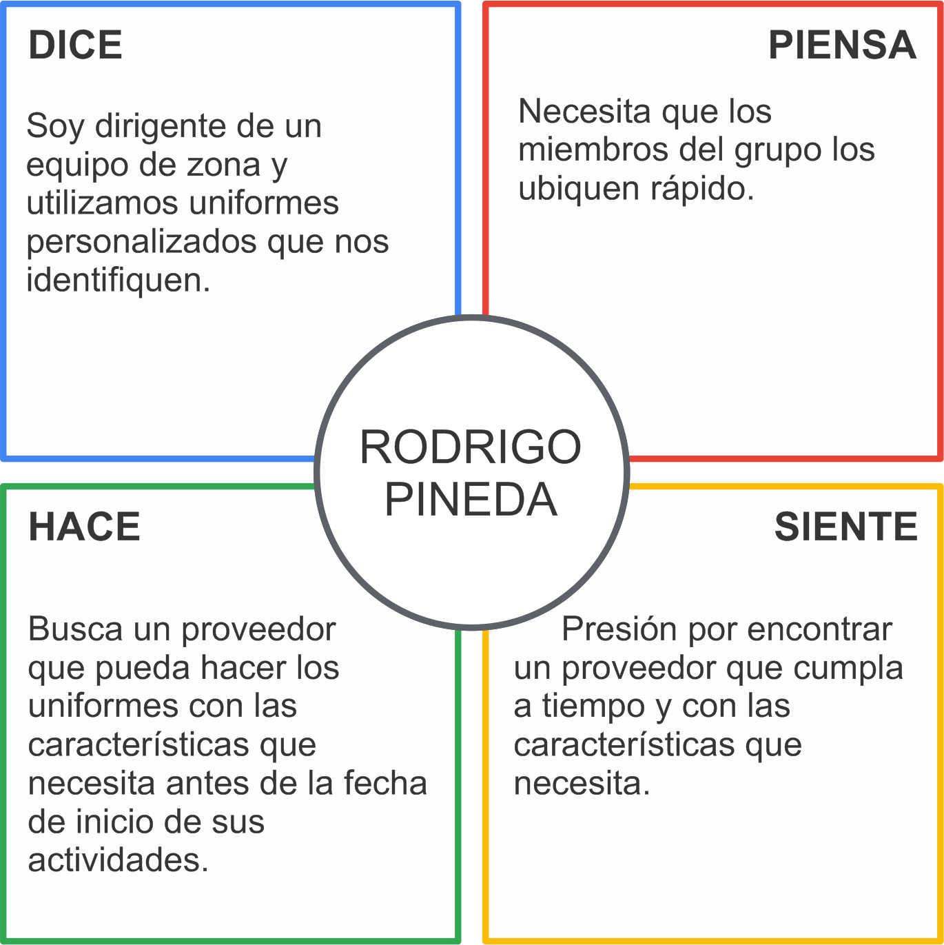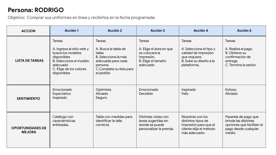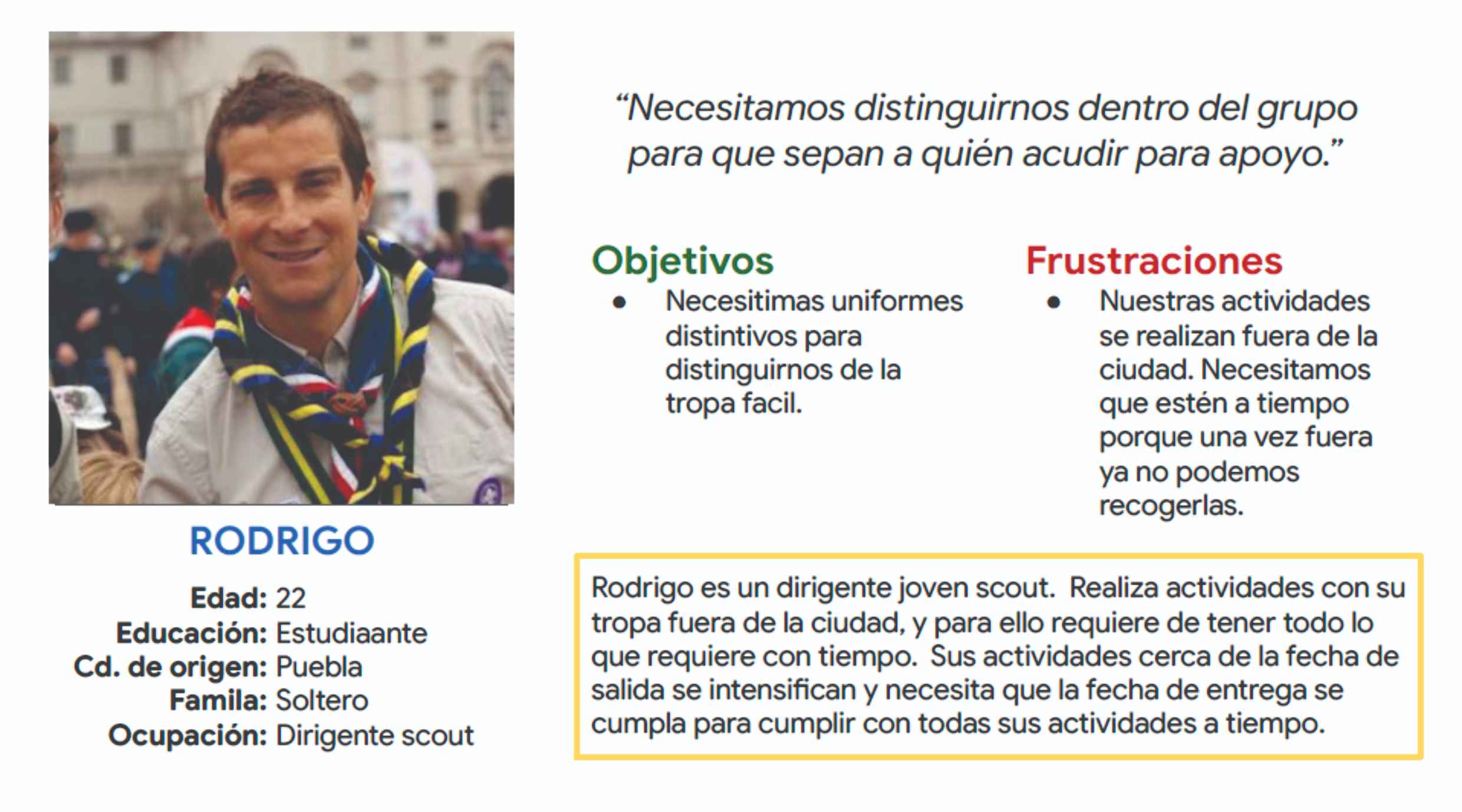 Por otro lado se encuentra el usuario “líder”, a quien nombramos Rodrigo, que son personas que dividen su tiempo entre escuela-trabajo y la actividad extra que lideréan, por lo que encontrar un tiempo para buscar precios y modelos les resulta sumamente complicado.